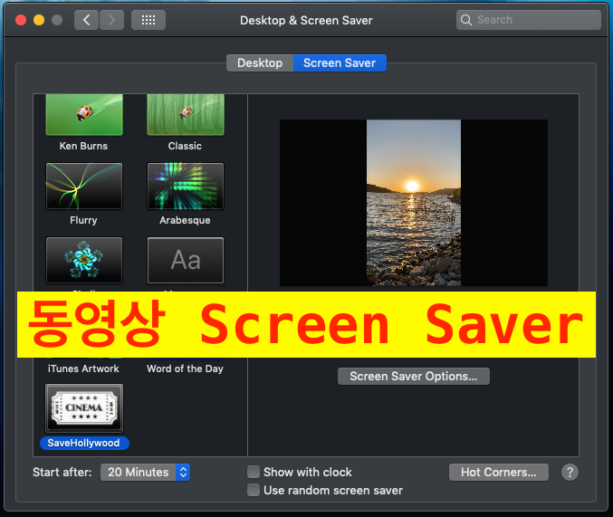 스크린 세이버 탭에 SaveHollywood 가 등록된 것을 확인할 수 있습니다.