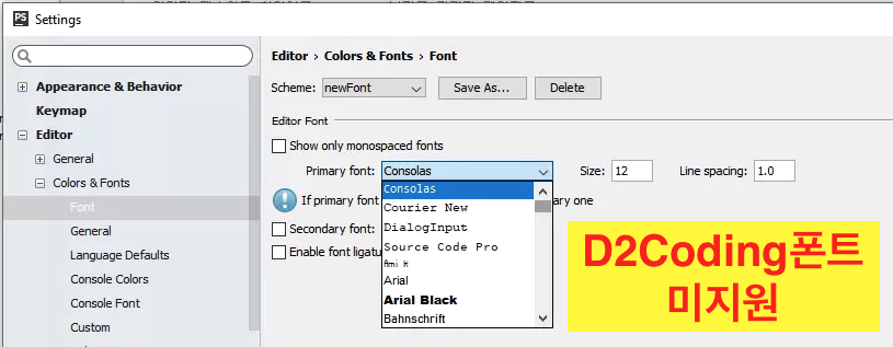 아쉽게도 D2 Coding폰트는 PHPStom(PS 이하)에 지원을 아직 하지 않고 있습니다.