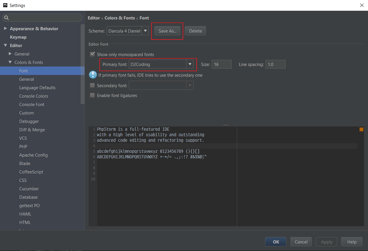 아쉽게도 D2 Coding폰트는 PHPStom(PS 이하)에 지원을 아직 하지 않고 있습니다.
