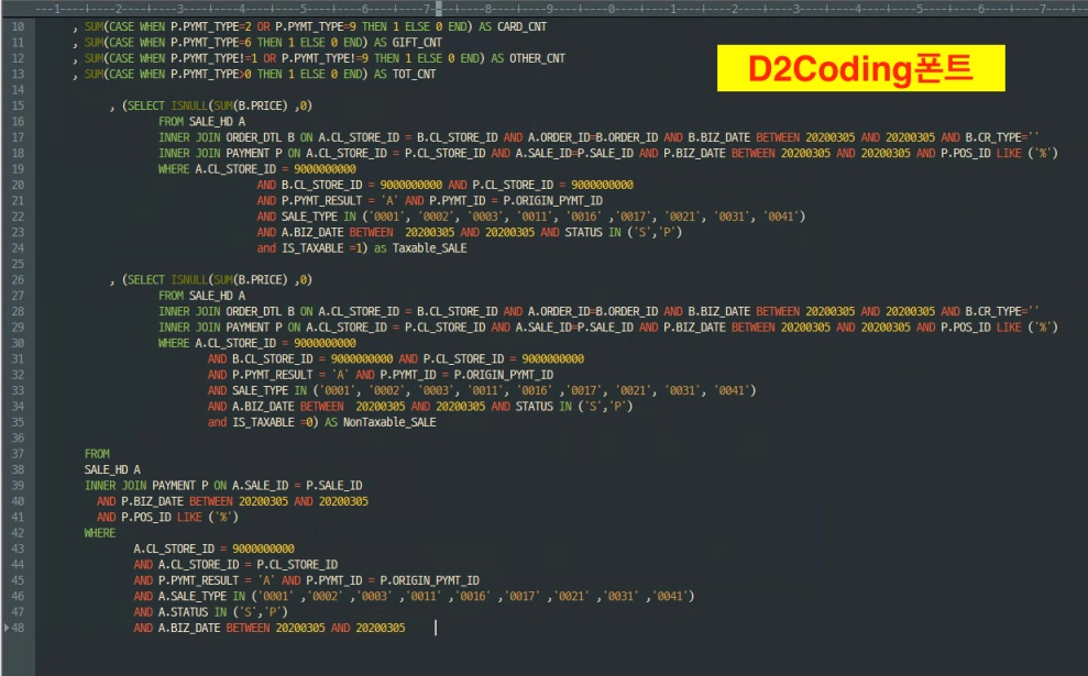 개인적으로 느끼기에 전반적으로 D2 Coding폰트가 글자의 width가 얇아진 느낌이 많이 듭니다.