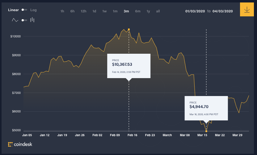 오늘 시점(04/03/2020)에 시세는 $6천7백불로, 다시금 상승세를 올라가려고 하는 것 같네요.