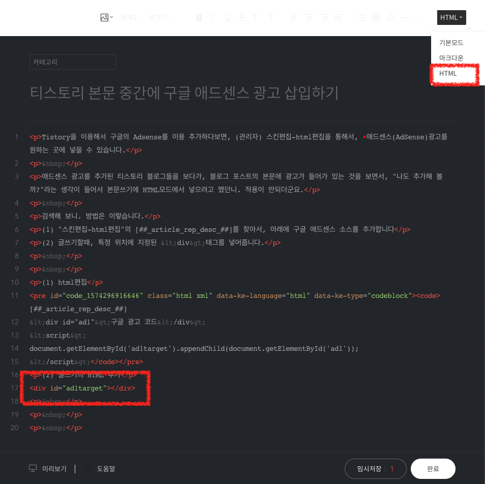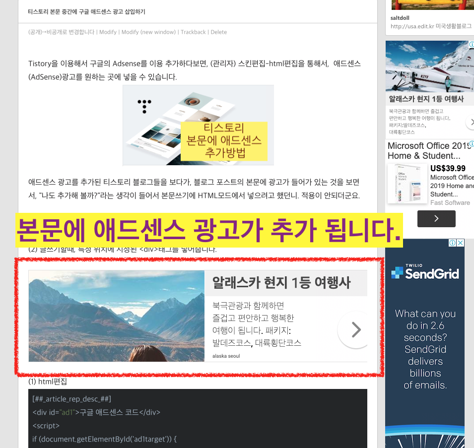 애드센스 광고를 추가된 티스토리 블로그들을 보다가, 블로그 포스트의 본문에 광고가 들어가 있는 것을 보면서, "나도 추가해 볼까?"라는 생각이 들어서 본문 쓰기에 HTML모드에서 넣으려고 했던니. 적용이 안되더군요.