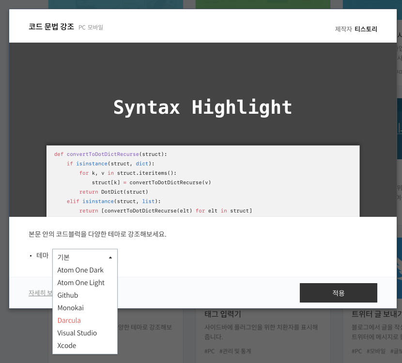 코드 문법 강조 테마에는 "Atom One Dark", "Atom One Light", "Github", "Monokai", "Darcula", "Visual Studio", "Xcode"는 있습니다. 여기서, 원하시는 테마를 선택하시면 됩니다.