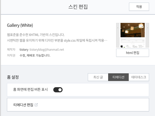 기존의 스킨도 [스킨 편집]의 [html 편집] 기능으로 "HTML"과 "CSS"을 수정 했었습니다.