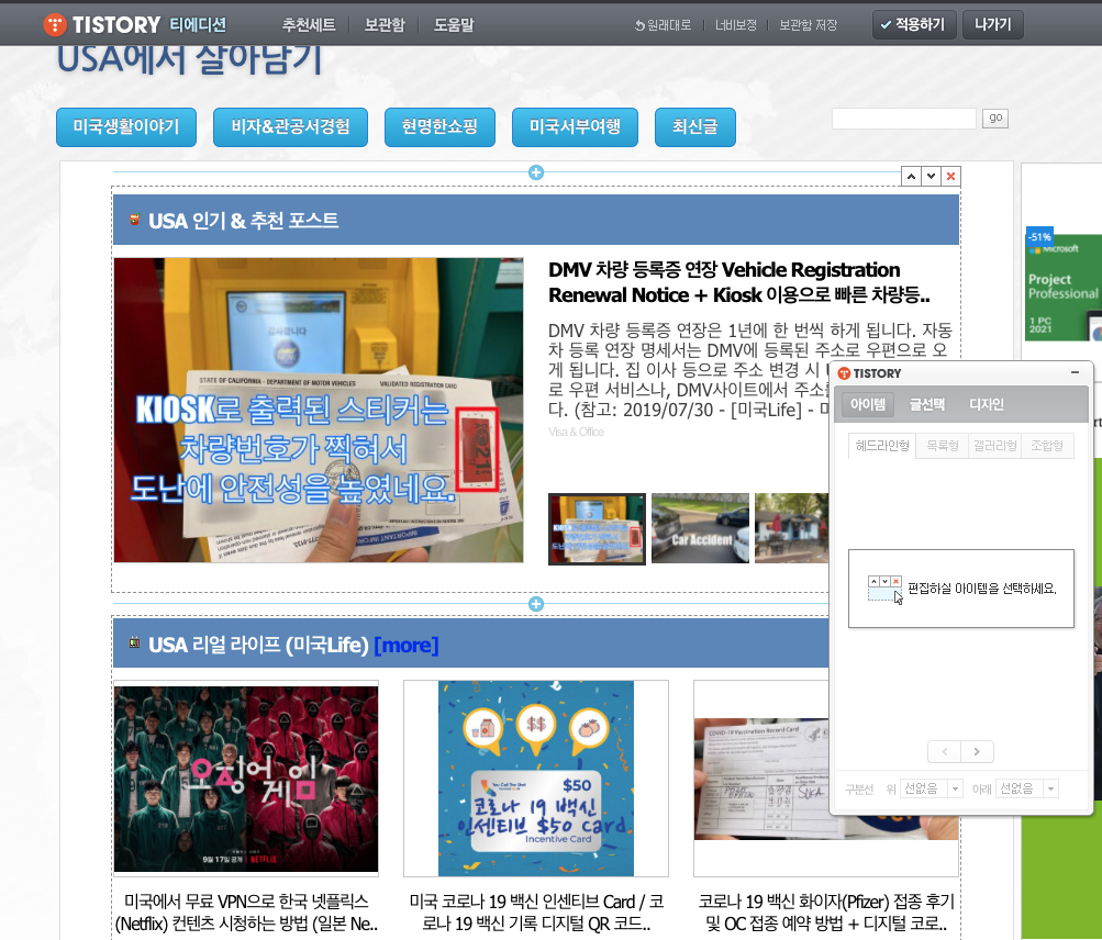 여기서, "티스토리 '메뉴'활용"을 선택해 주시면, 상단 메뉴가 활성화됩니다.