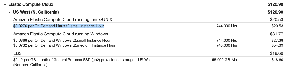 참고로, 예약 인스턴스 구매가 없을 경우 다음과 같이 Reserved Instances에 대한 문구가 없이 시간별 가격만 나타납니다.