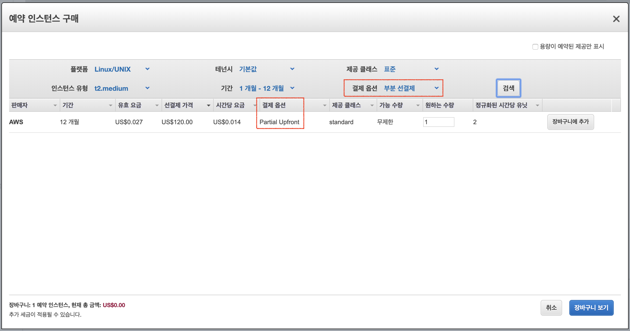 인스턴스 유형 선택 -> 기간 선택 -> 제공 클래스 선택 -> 결재 옵션(부분 선결제) 선택 -> [검색]