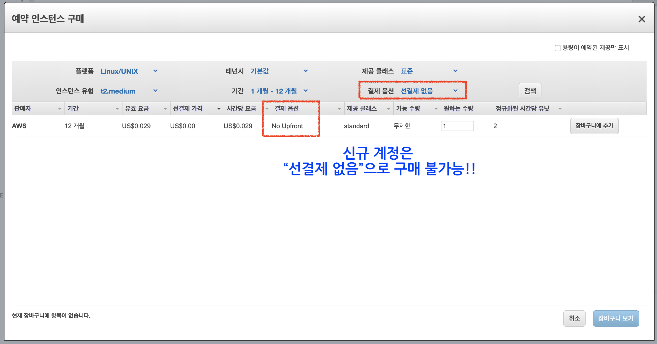 결재 옵션을 "선결재 없음(No Upfront)"으로 선택해서 구매가 불가능합니다.