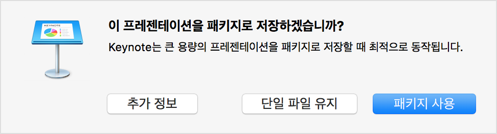 애플에 오피스 제품인 Pages, Numbers 또는 Keynote에서 큰 동영상과 같은 내용을 추가하면 파일 저장 시, "패키지" 또는 "단일 파일 유지"를 선택해서 저장하라는 메시지를 보게 됩니다. (500MB보다 큰 파일)