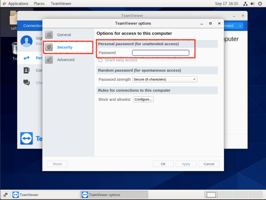 팀뷰어 메뉴에 Exteras > Options에 Security에서 Personal password를 입력하면 됩니다.