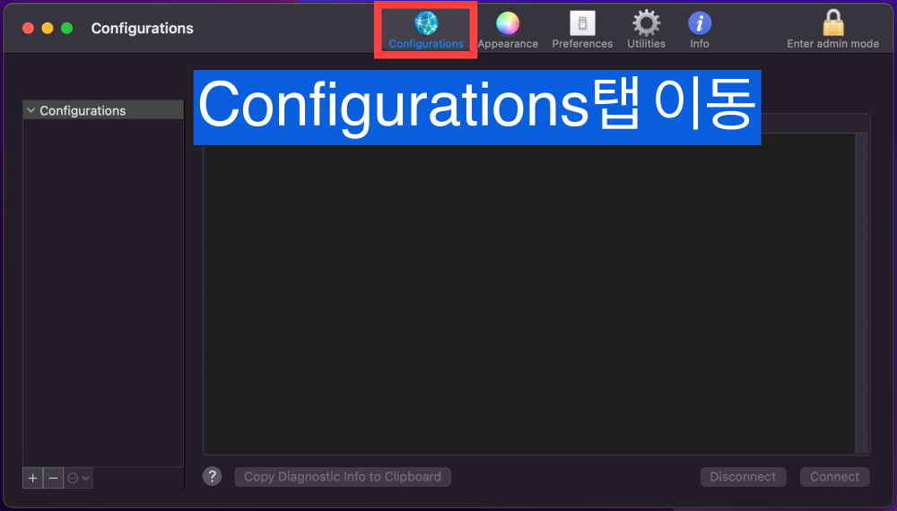 OpenVPN설정 파일 추가를 위해서, Configurations탭으로 이동합니다.