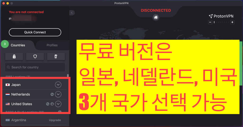 ProtonVPN의 Free버전에는 3개국(일본, 네덜란드, 미국)은 무료 사용 가능합니다.