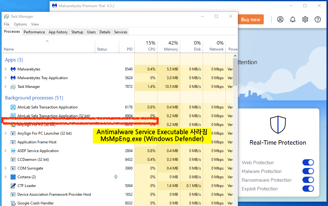 - MsMpENg.exe의 시스템 점유율을 낮출 뿐 프로세스는 그대로 있습니다.