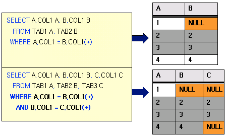 (+)기호는 Oracle 8i까지는 한쪽에만 가능, Oracle 9i이후부터 Full Outer Join으로 양쪽까지 가능