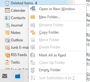 폴더 목록 보기 버튼 - 탐색 창에서 지운 편지함 폴더를 마우스 오른쪽 단추로 클릭한 다음 폴더 비우기를 클릭합니다.
