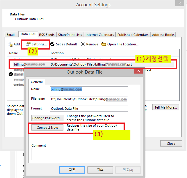 파일(File) 탭 선택 > 계정 설정으로 계정 선택 - 데이터 파일 탭에서 압축할 데이터 파일을 클릭한 다음 설정을 클릭합니다.