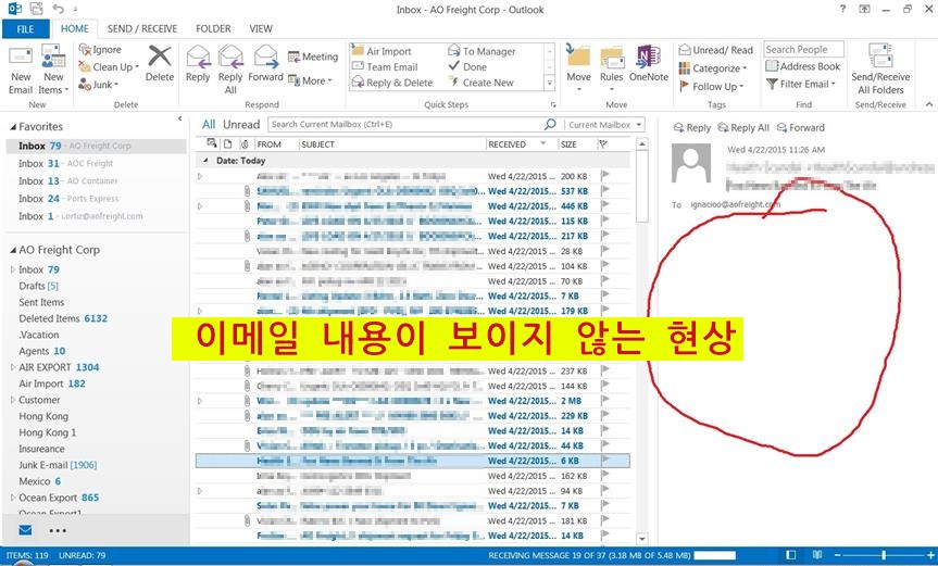 느려지는 현상 또는 이메일 본문이 전체가 나타나지 않는 이상한 증상이 있을 수 있습니다.