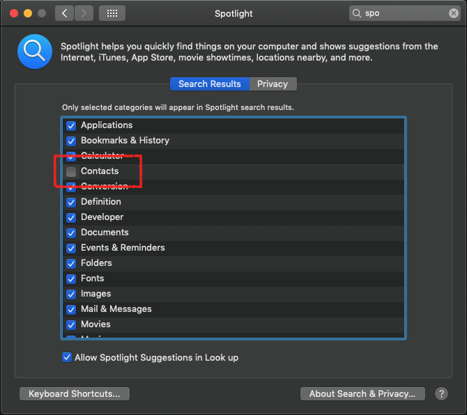 Spotlight Search 스포트라이트 검색에서 주소록 빼기