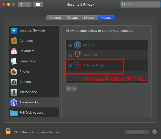 System Preferences > Security & Privacy > Privacy > Accessibility => [v] VMware Fusion 체크