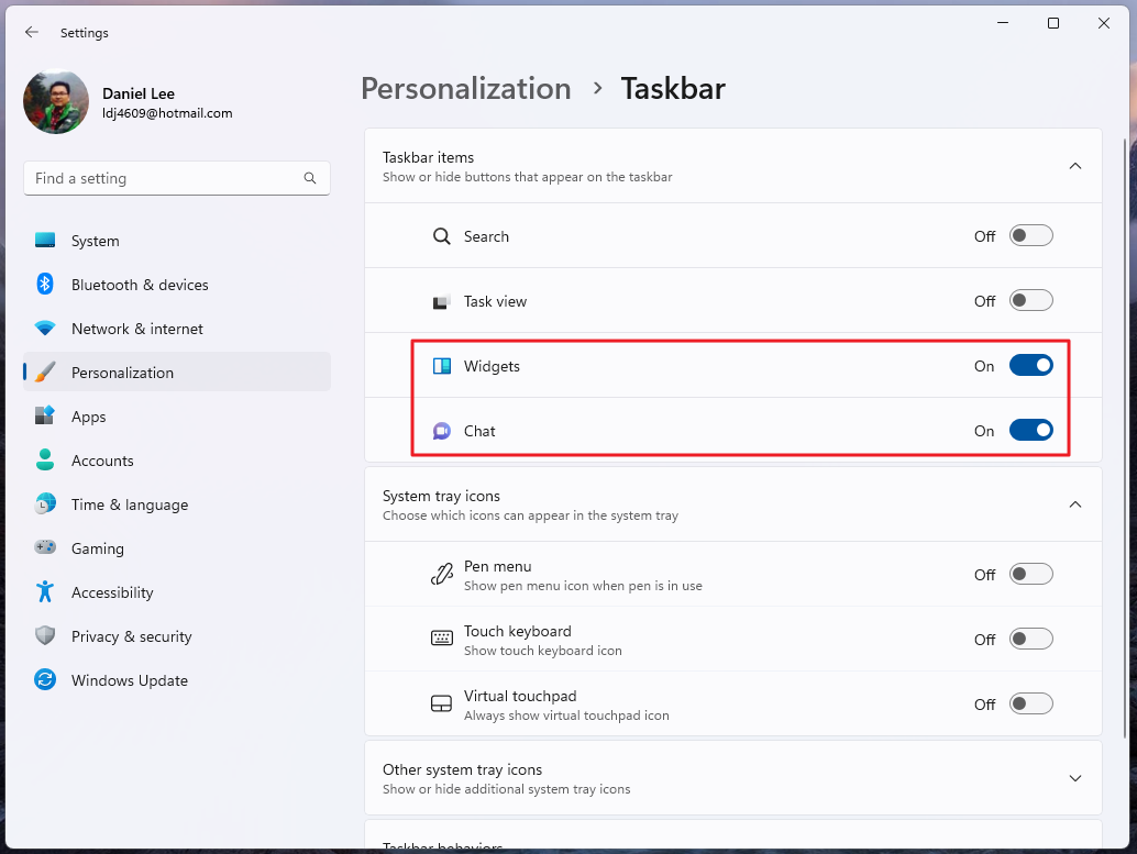 작업표시줄(Taskbar)에서 채팅(Chat) 아이콘과 위젯(Widgets)을 발견하게 됩니다.