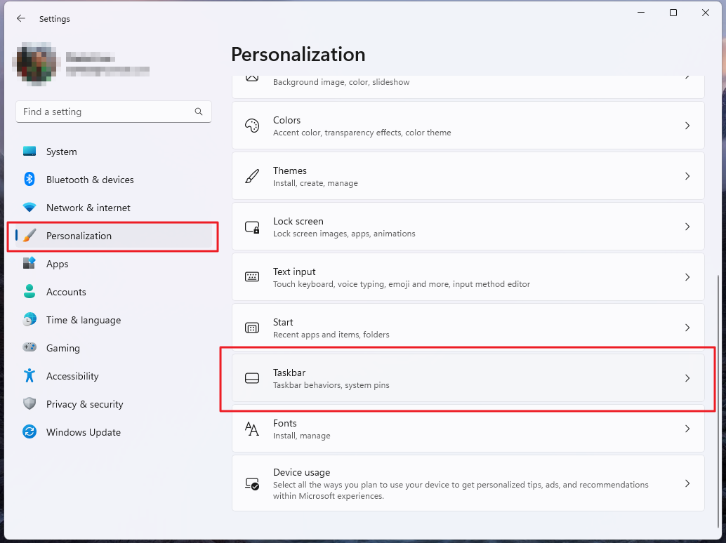 설정(Settings) 중에 "개인 설정(Personalization)"으로 이동해서,