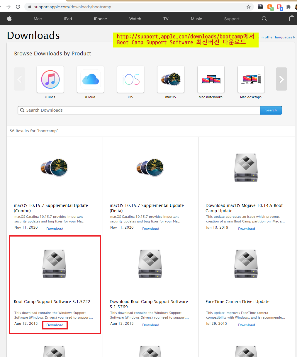 Bootcamp Support Software의 최신버전을 애플 공식 사이트에서 다운로드합니다.