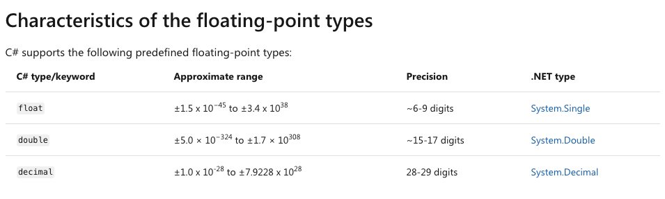 C#에서 나오는 숫자 타입에 쓸수 있는 타입들: 돈을 사용하는 곳에는 decimal를 꼭 이용해 주세요.