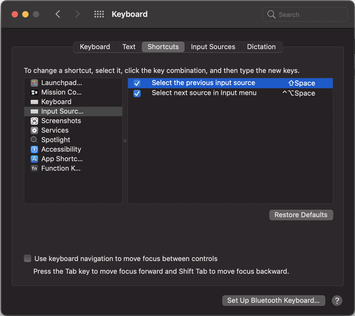 Keyboard에서 Shortcuts > Input Sources에