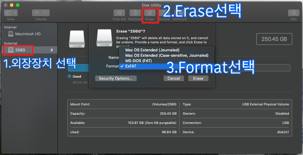 macOS에서는 Disk Utility로 포맷하면,