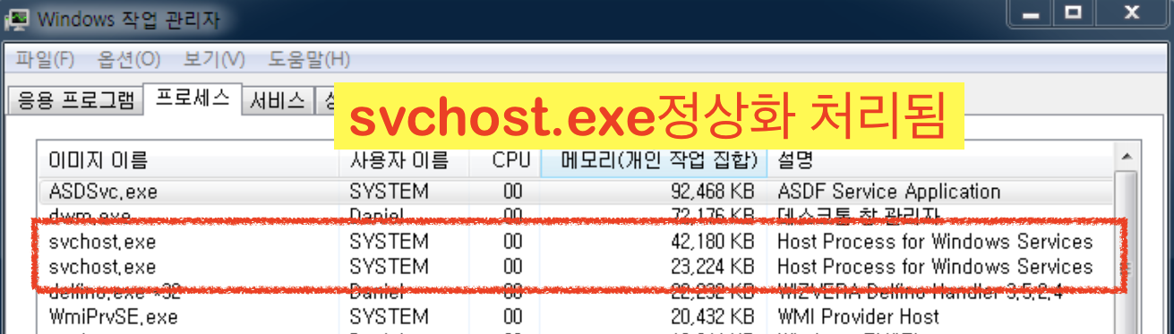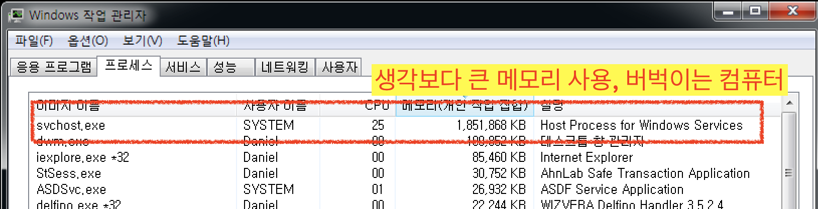 그 증상의 초기로는 svchost.exe 파일이 메모리를 너무 많이 사용하는 이상 증상을 보여줍니다.
