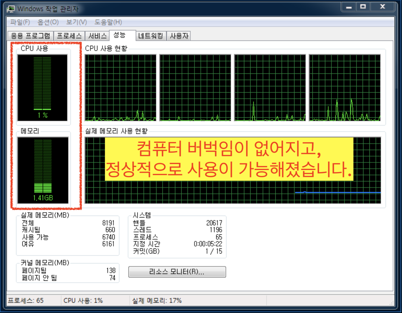 윈도우 업데이트를 끄고, 리부팅을 해주면 정상적인 증상을 보이게 됩니다.