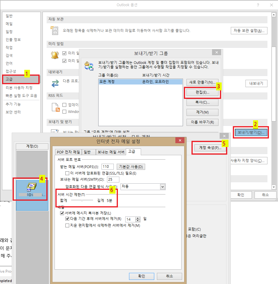 방법2) 아웃룩의 경우 "계정>고급>서버 시간 제한 (1분에서 5분으로 늘려주기) 변경"