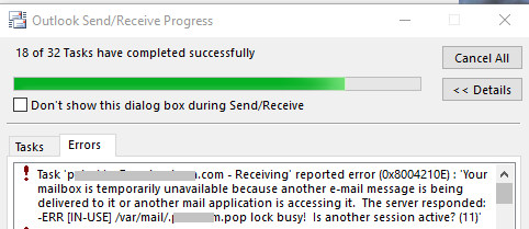 아웃룩에서 메일을 받기를 하려고 할 때, 갑자기 -ERR [IN-USE] /var/mail/.user.pop lock busy! 라는 메시지가 뜨면서, 메일 수신이 안 되는 경우가 발생할 수 있습니다. 이 케이스의 경우 Gmail이나 다른 계.