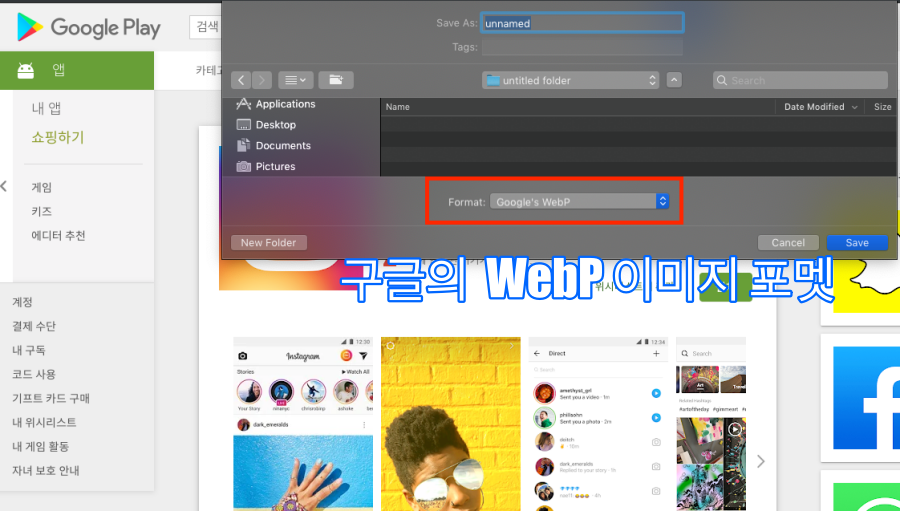 우연히 Google Play에서 나온 이미지를 Chrome브라우저에서 이미지 저장이 필요해서 받으려고 했더니, WebP라는 포멧으로만 저장이 되더군요.