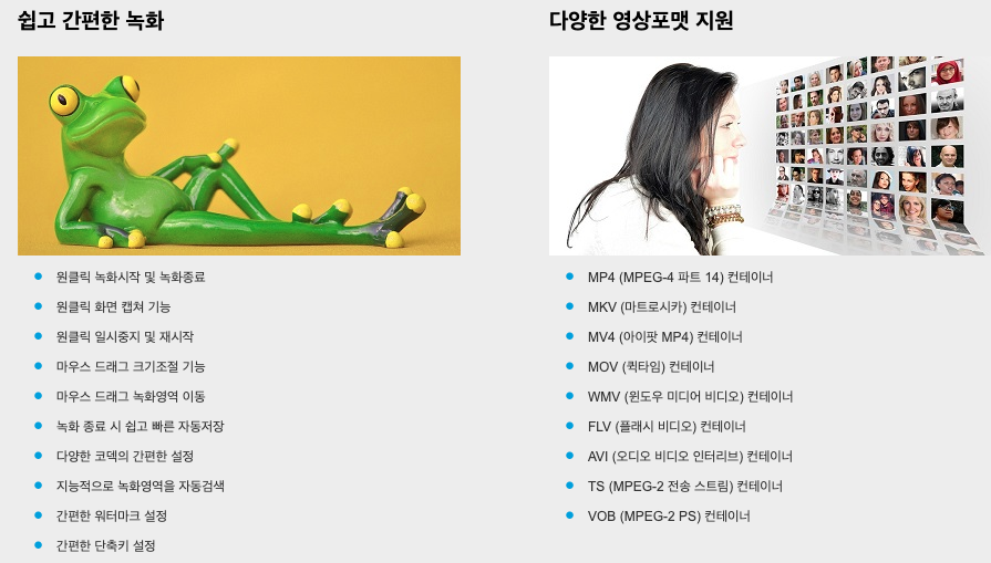 온라인게임과 인터넷영상을 효과적으로 녹화할 수 있으며 다양한 포맷으로 제한 없는 길이의 녹화를 안정적으로 진행할 수 있습니다.