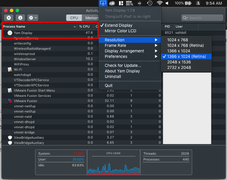iPad 쪽 화면의 해상도를 높이면 CPU의 사용률이 높아집니다. (Macbook Air 13" 2013 기준)