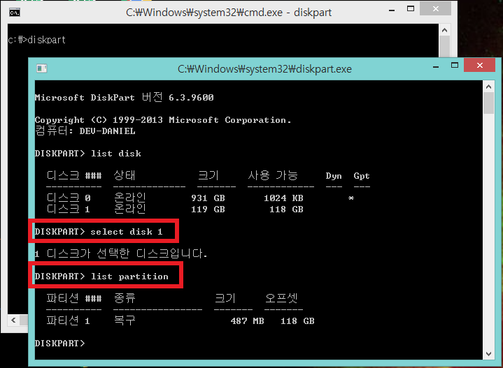 "select partition 1" 명령으로 복구 파티션을 선택,