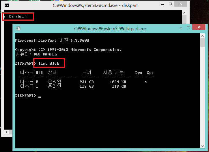 cmd(Command Prompt)명령어인 diskpart프로그램을 실행해야 합니다.