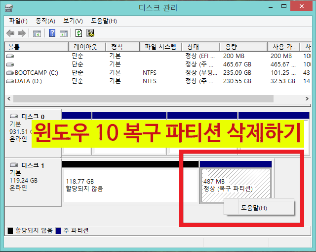 복구 파티션(Recovery Partition)을 삭제하기 위해서,