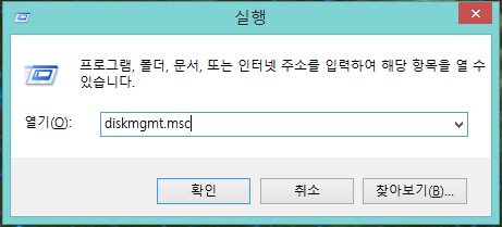 먼저, 현재 사용 중인 디스크 관리(Disk Management)를 실행해서 확인해 봅니다.