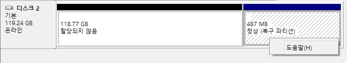 118.77GB였던 파티션이 119.24GB으로 정상적으로 파티션이 나눠졌습니다.