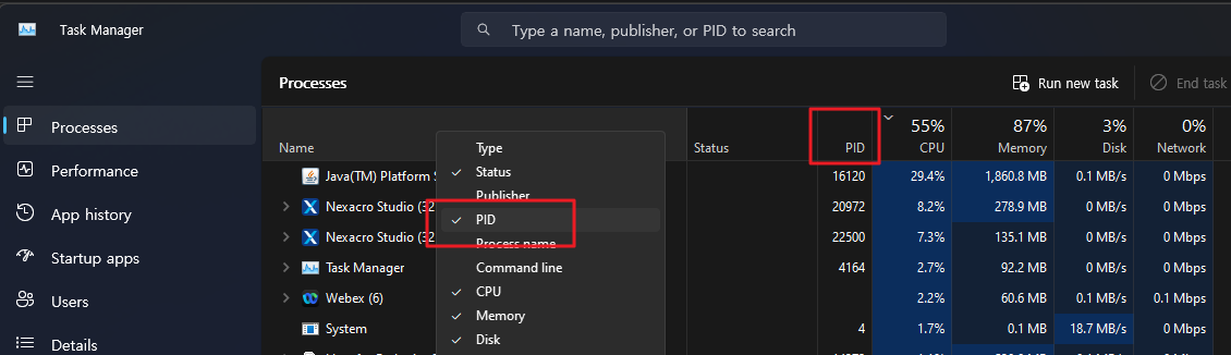 작업 관리자를 PID를 확인으로, 네트워크를 사용하고 있는 프로그램을 확인할 수 있습니다.