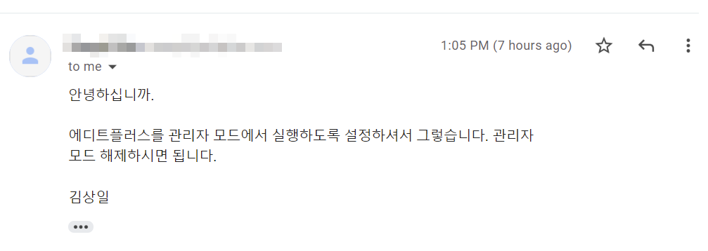 이 경우, EditPlus프로그램이 관리자 모드로 실행되어 오류가 발생한 것입니다.