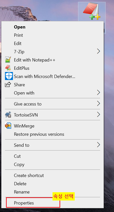 Editplus실행 파일의 속성(Properties) 선택해 줍니다.