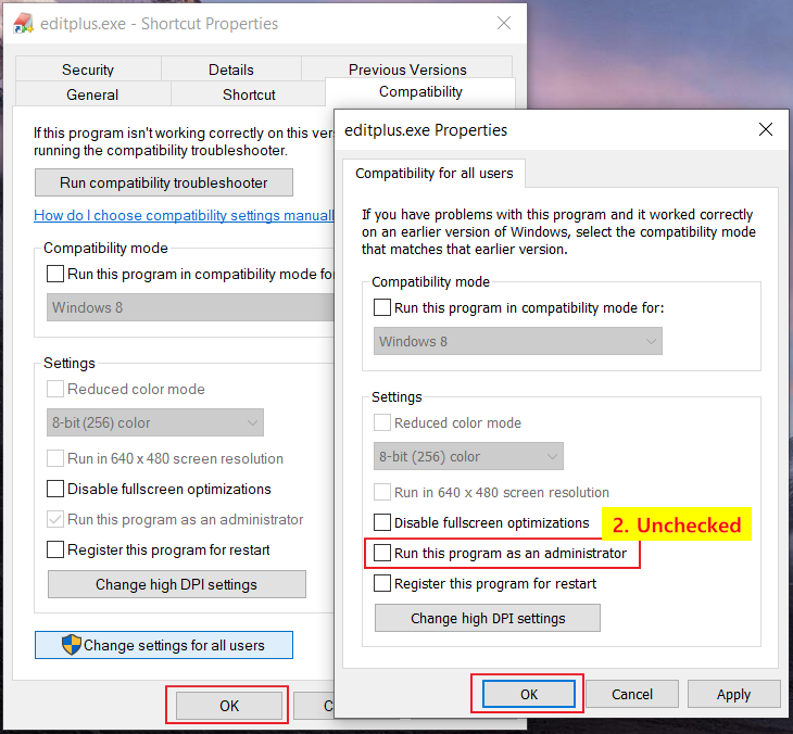 팝업이 뜬 창에서 "관리자 권한으로 이 프로그램 실행(Run this program as an admin)"을 언체크 해야 합니다.