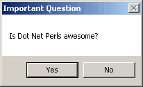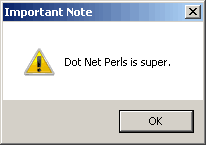 MessageBox.Show("Dot Net Perls is super." , "Important Note" , MessageBoxButtons.OK , MessageBoxIcon.Exclamation , MessageBoxDefaultButton.Button1); |