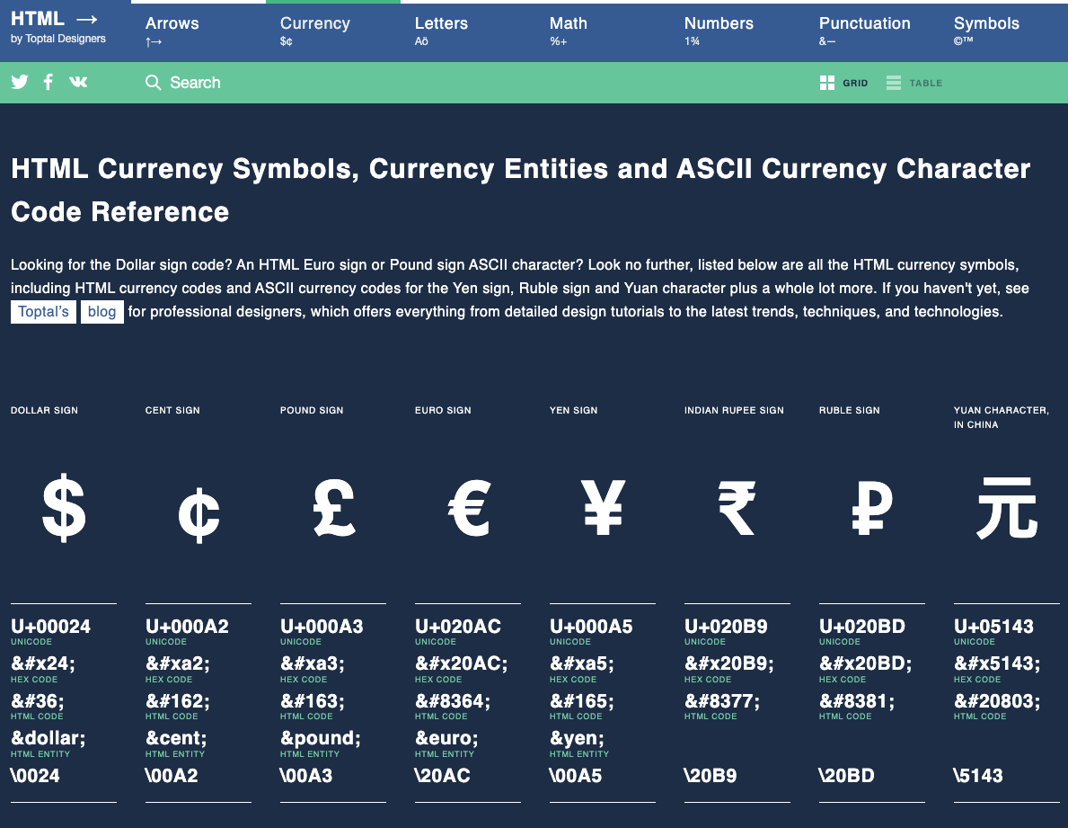 HTML Number Symbols, Entities and Codes — Toptal Designers