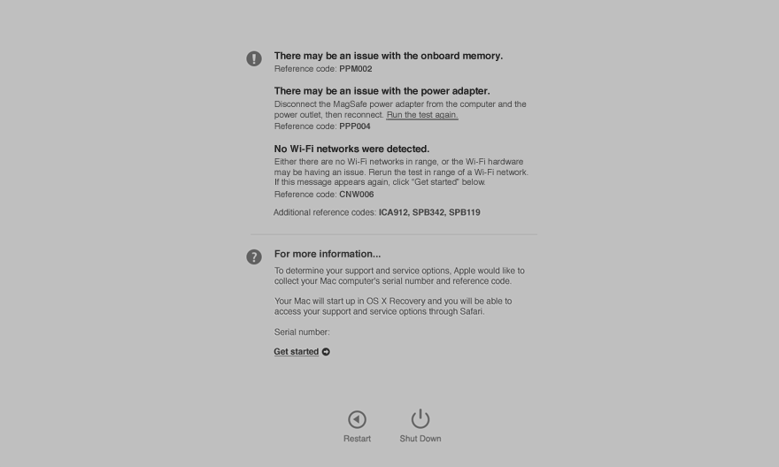14분 걸린다고 했는데, 좀 더 조금 걸린걸 같네요. - Mac을 검사하는 데는 2~3분 정도 소요됩니다. 문제가 발견되는 경우 Apple 진단은 해결 방법을 제안하고 참조 코드를 제공합니다. 계속 진행하기 전에 참조 코드를 기록해 둡니다.