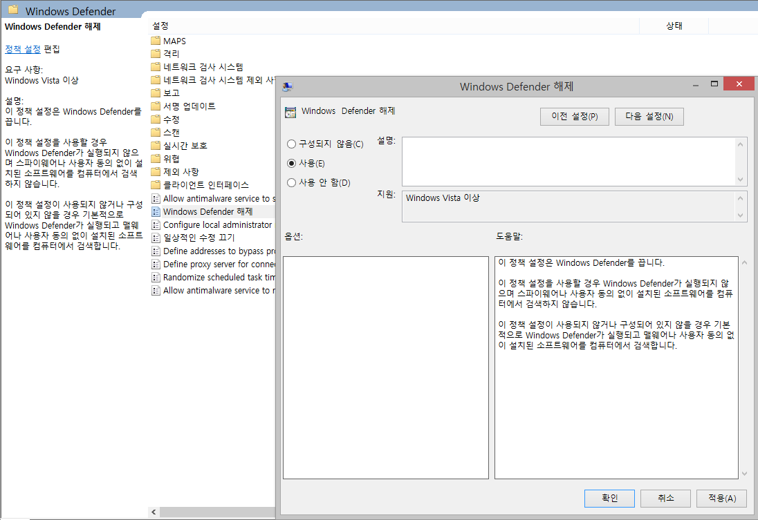 "Window Defender 바이러스 백신 사용 안함"를 눌러서 "사용"으로 변경해 주시면 됩니다.