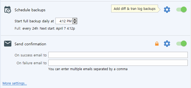 Database Backup in 2 min No more complicated configuration, just a single form to automate backups: select databases, backup (full, diff, tran log), encrypt, compress, send to a folder, FTP or cloud service: schedule backups, receive confirmation emails an